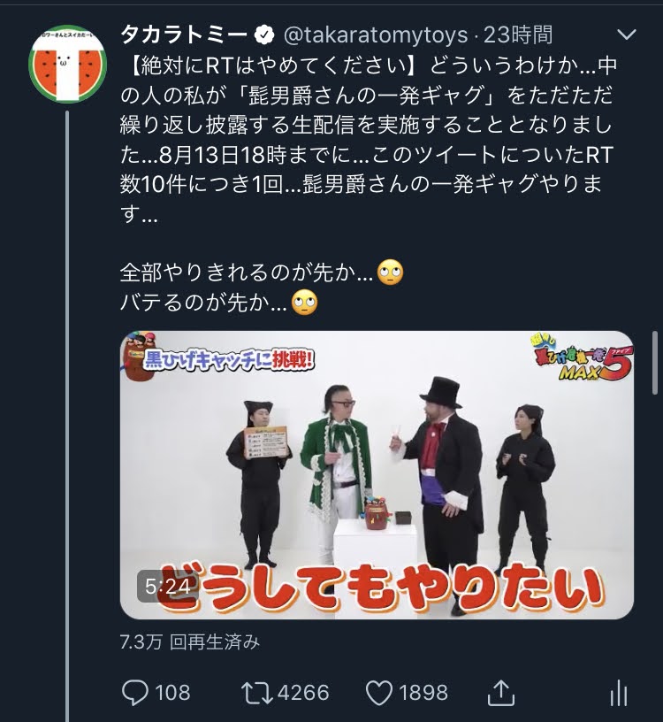 タカラトミー Twitterissa お笑い素人の一介のタカラトミーツイッター担当者が ただただ426回ギャグを繰り返す 文字面だけでも地獄のような生配信を明日11時頃からやります 終わるまで何時間かかるんだ 絶対に見ないでください